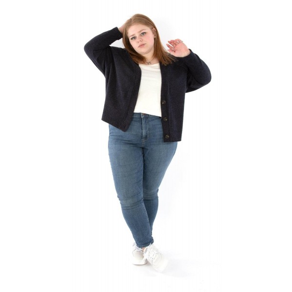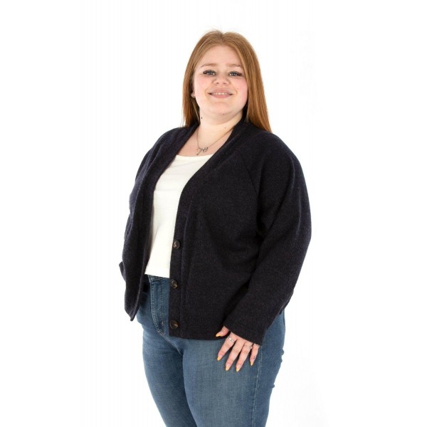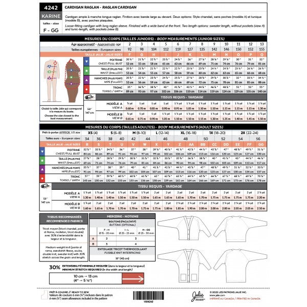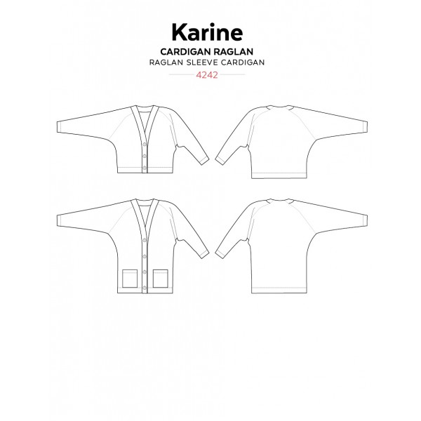 Cardigan ample à manche longue raglan. Finition avec bande large au devant. Deux options: Style chandail, sans poches (A) et tunique (B), avec poches plaquées.